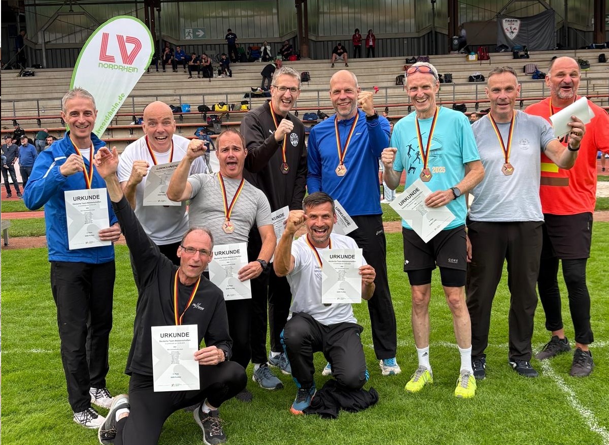 Etwas bedröppelt schlichen die Athleten der Startgemeinschaft OWL am Samstagabend zur großen Siegerehrung im Leichtathletikstadion des TSV Bayer Leverkusen. 7 Stunden Teamwettkampf in insgesamt 8 Disziplinen lag hinter dem M50-Team und jeder hatte sich voll reingeworfen. Vor der abschließenden Staffel trennten die Teams auf Platz 2 bis 4 nur wenige Punkte. Auch in der 4x100m-Staffel ging es eng zu, aber im Ziel schien es nur zum undankbaren Platz 4 gereicht zu haben.
